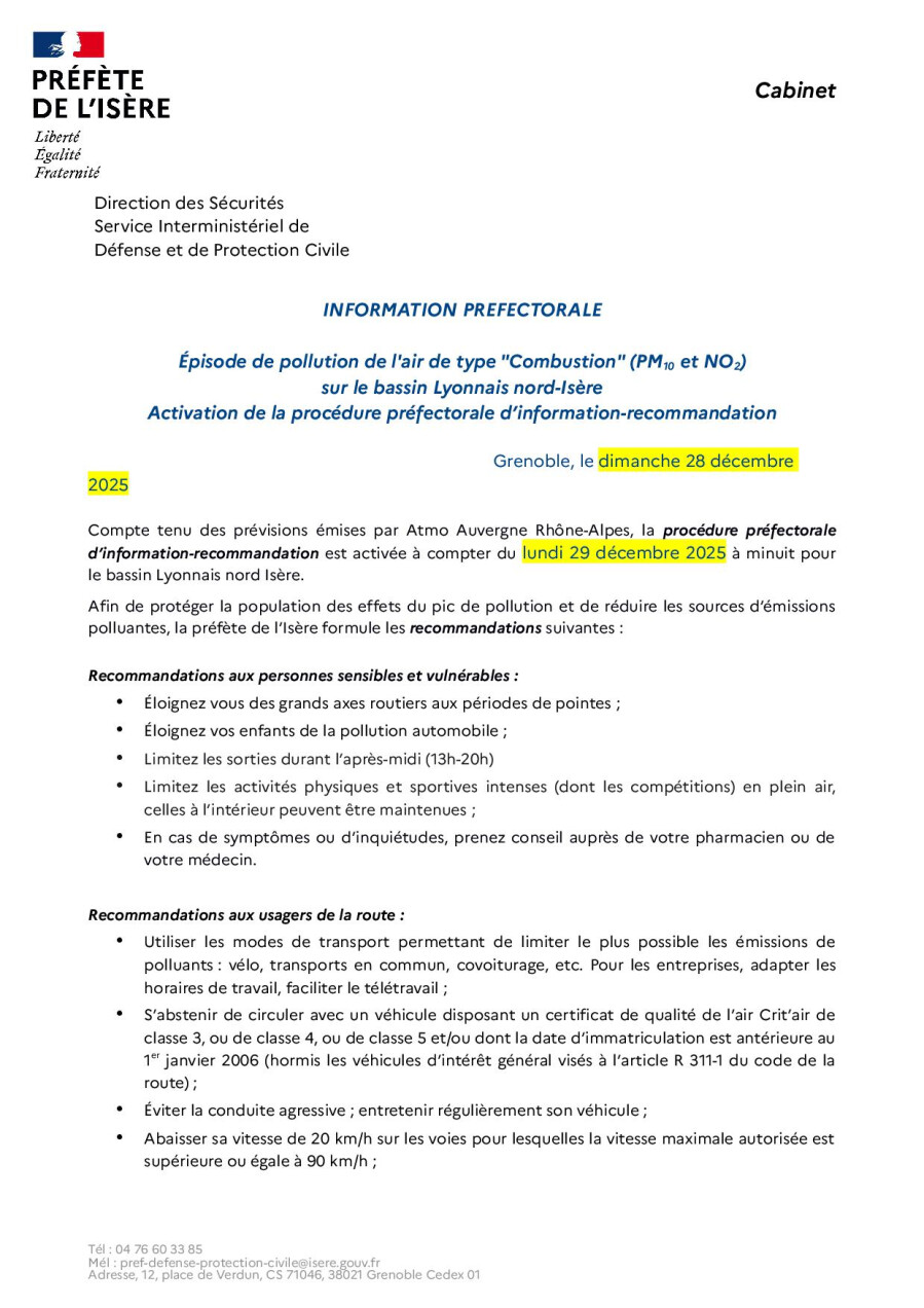 En nord-Isère, En raison de taux élevés dus à la combustion du chauffage et des moyens de transports, entre autres, les recommandations de la préfecture de l'Isère sont les bienvenues.