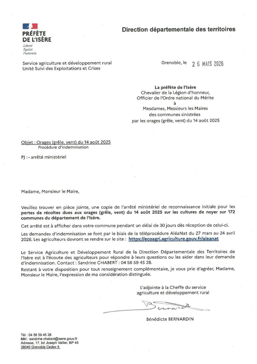 Vous trouverez en pièce jointe, une copie de l’arrêté ministériel de reconnaissance initiale pour les pertes de récoltes sur noyers suite aux orages (grêle et vent) du 14 août 2025.
