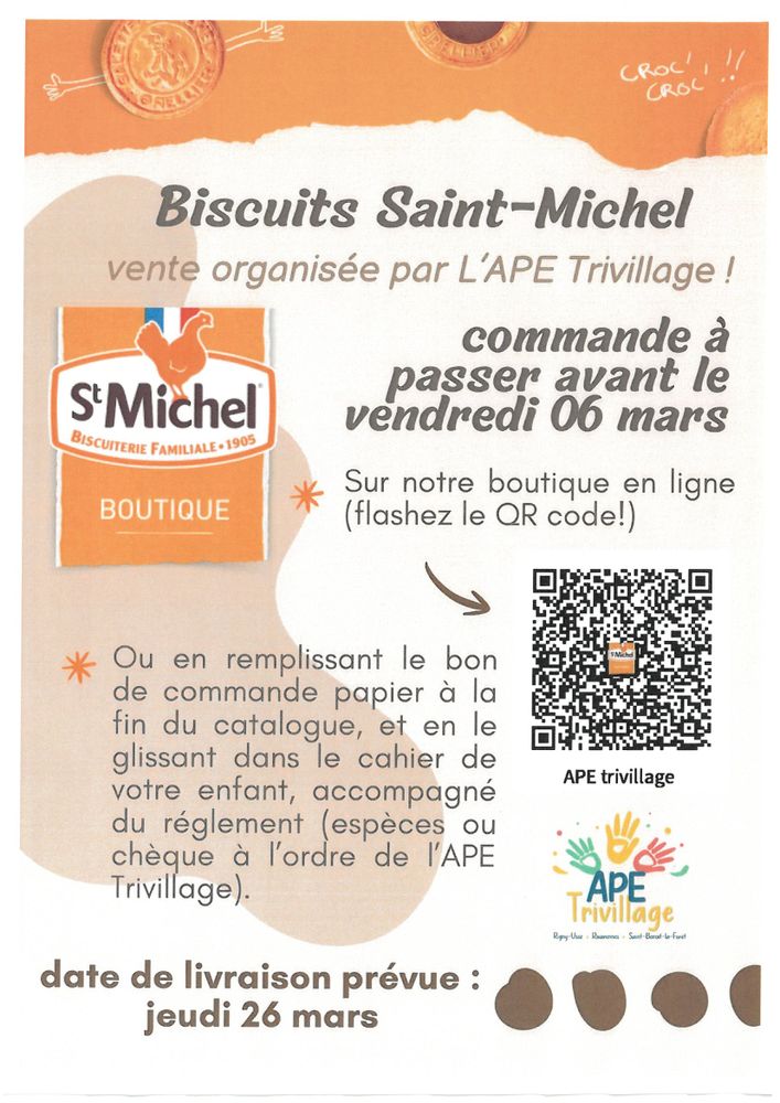 - Biscuits Saint-Michel : vous avez reçu le catalogue papier dans le cahier de votre enfant. Vous pouvez passer commande via ce catalogue ou, encore mieux, via la boutique en ligne : https://boutique.stmichel.fr/participer-vente-associative?sale_reference=XBZSCXQBON