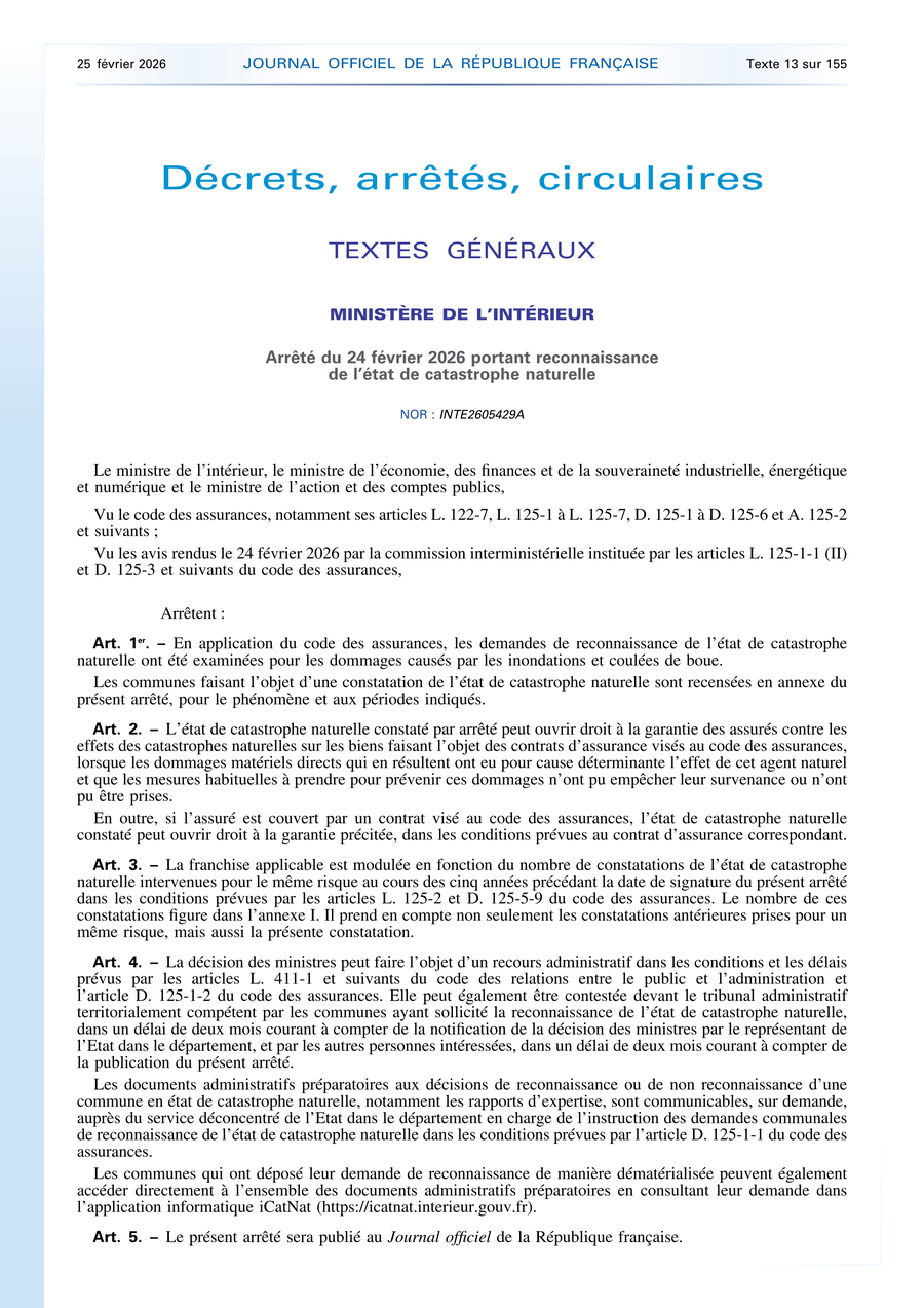 L’arrêté de catastrophe naturelle vient d’être publié au journal officiel. Il est daté d’hier et concerne les effets des inondations et coulées de boues que notre commune a subies. Les personnes victimes de cette catastrophe disposent de 30 jours pour en faire la déclaration auprès de leur assureur.