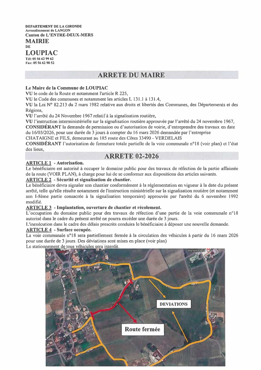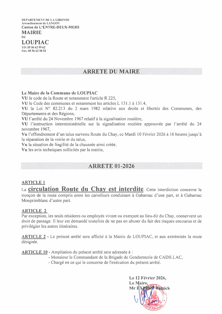 Le centre routier départemental vient de nous faire savoir que la route départementale 117 reliant Loupiac à Sainte Croix du Mont ( par les coteaux) serait fermée ce jeudi 26 / 02 / 2026 pour évacuation des arbres tombés pendant la tempête NILS