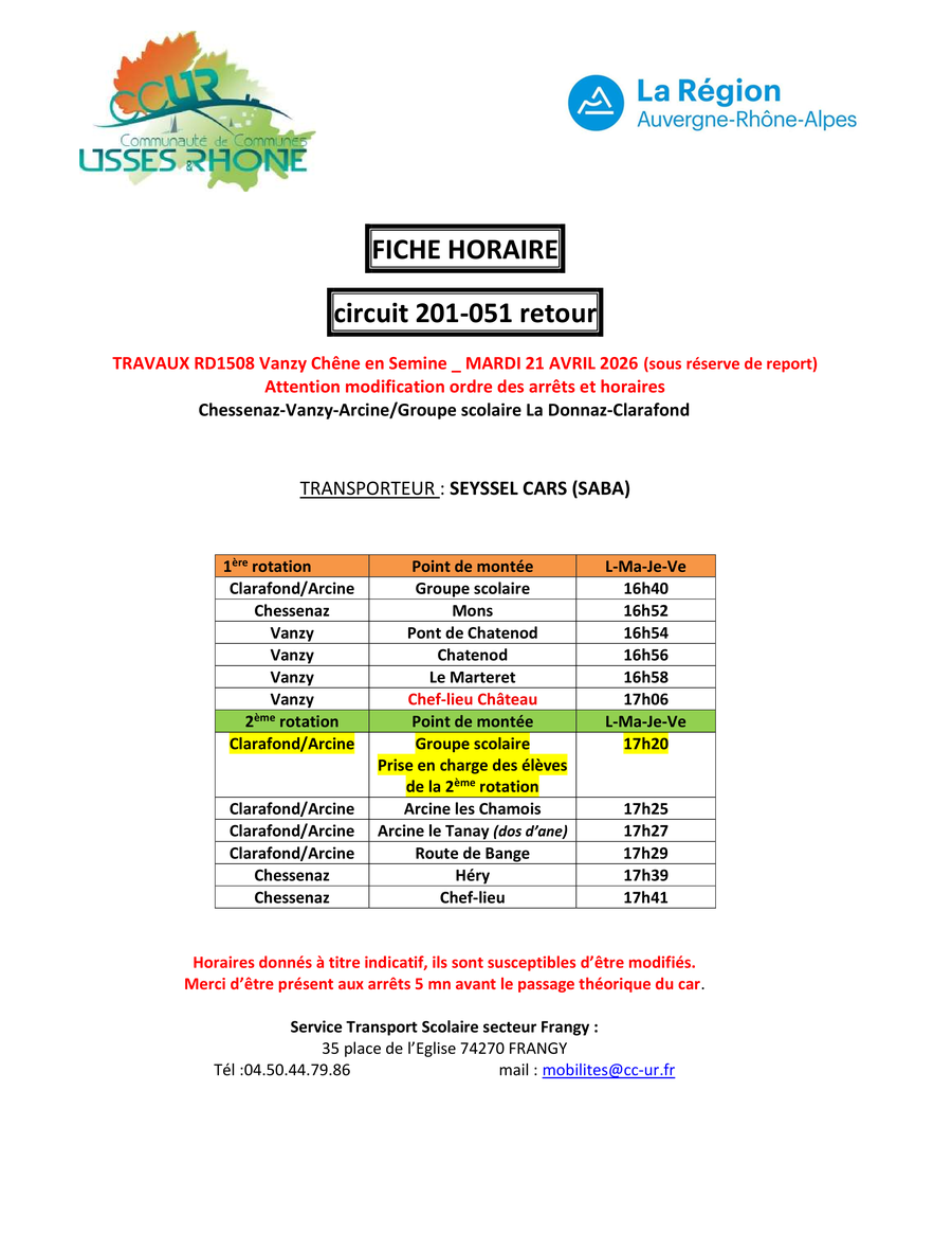 Déviation par Chessenaz mise en place. Modification de l’ordre des arrêts et retards à prévoir par rapport aux horaires habituels. (Fiche horaire ci-jointe)