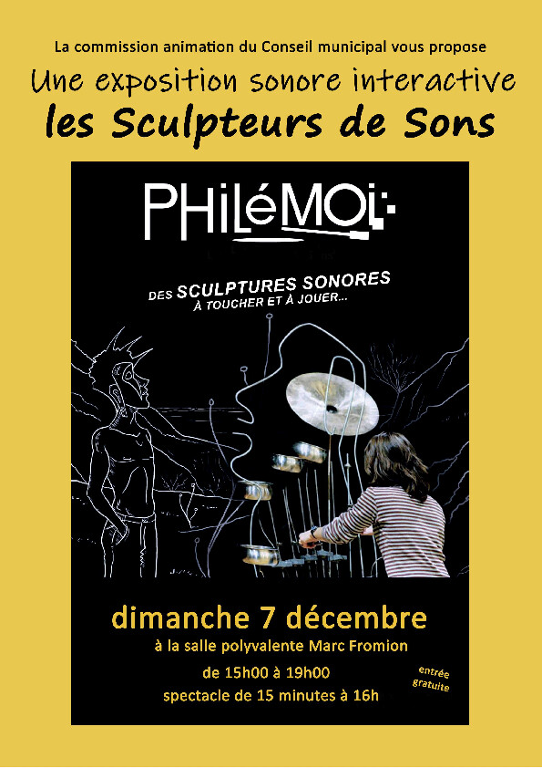 Pour rappel, nous vous attendons nombreux demain dimanche 7 décembre entre 15h00 et 19h00 à la salle polyvalente pour l'exposition sonore interactive proposée par PHILéMOI.