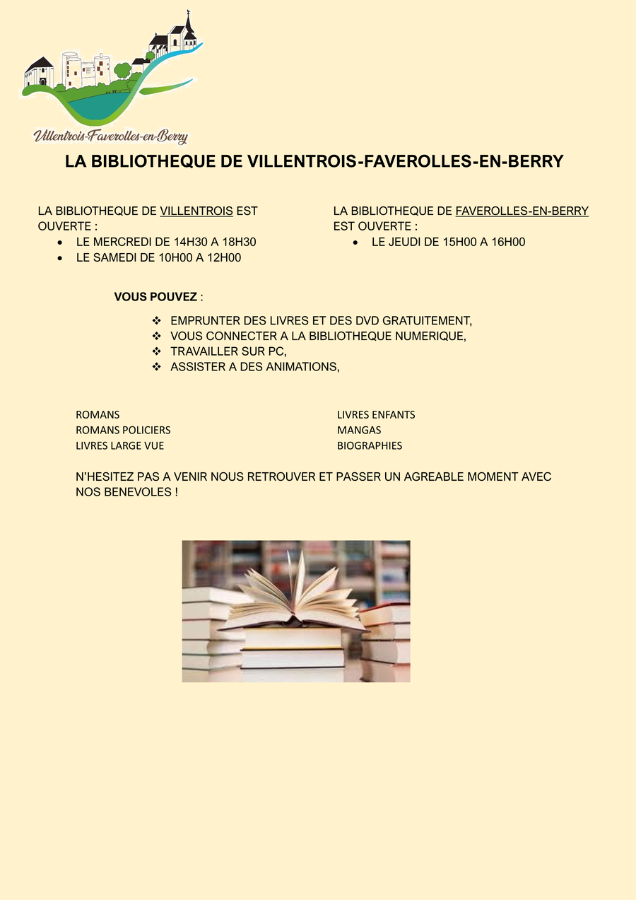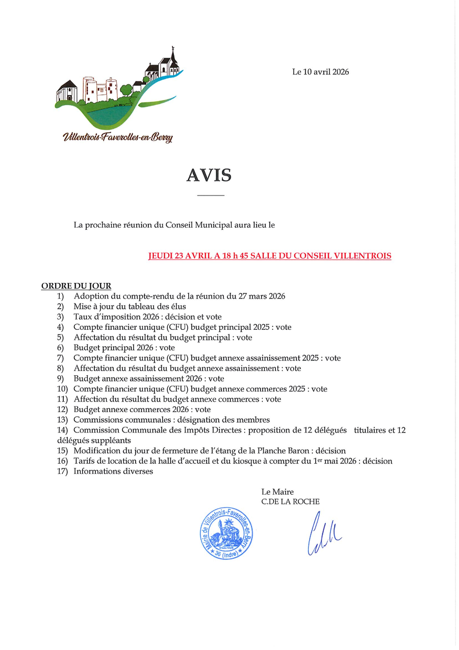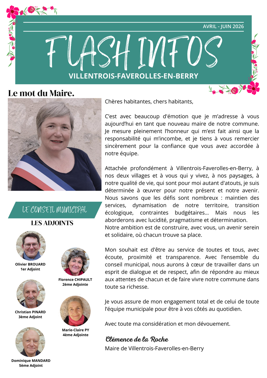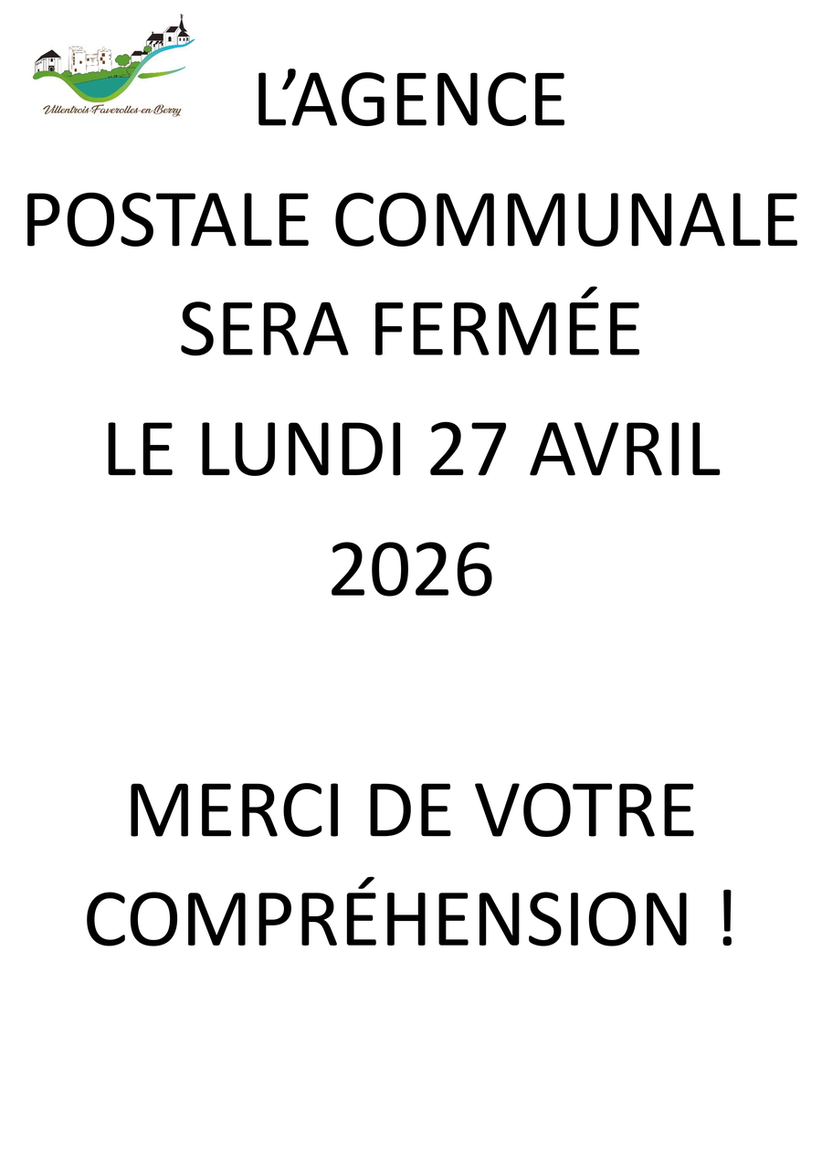 Une permanence, tenue par le maire ou les conseillers, se tiendra le 1er samedi et le 3ème samedi de chaque mois de 10h30 à 12h00 à Villentrois et à Faverolles-en-Berry, excepté les jours fériés.