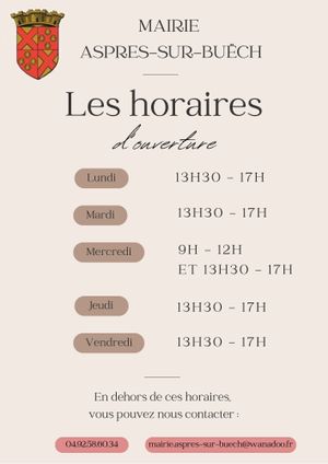 Lundi, mardi, jeudi et vendredi : de 9h à 17h