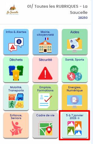 En complément, les panneaux à vocation pérenne ont été dispatchés dans des RUBRIQUES accessibles en 1 seul clic sur smartphone, à partir d'une nouvelle entité "01/ Toutes les RUBRIQUES - La Saucelle (28250)"