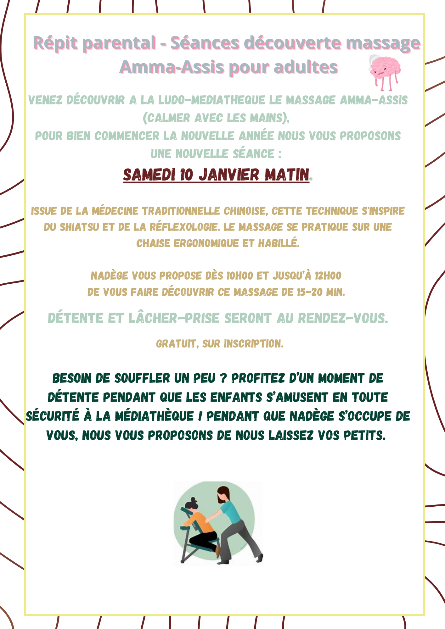 💆👶 Une nouvelle matinée de répit parental le SAMEDI 10 JANVIER. Mais au fait ça consiste en quoi? Venez avec vos enfants et pendant qu'ils jouent avec nous, profitez d'une séance de massage Amma-assis.