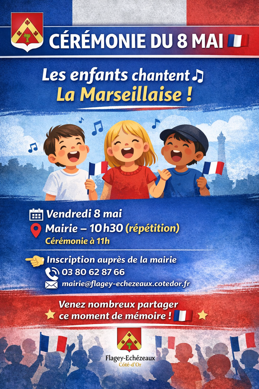đ¶ Nous invitons les enfants volontaires Ă venir chanter la Marseillaise lors de la cĂ©rĂ©monie officielle.