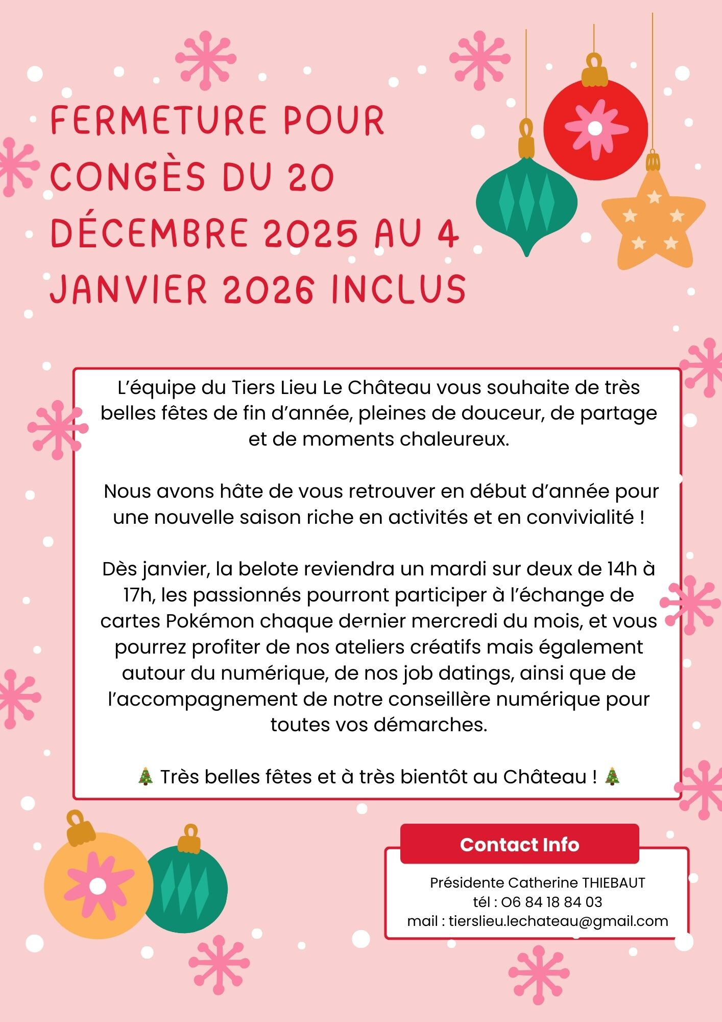 Le Tiers Lieu Le Château sera fermé du 20 décembre 2025 au 4 janvier 2026 inclus.