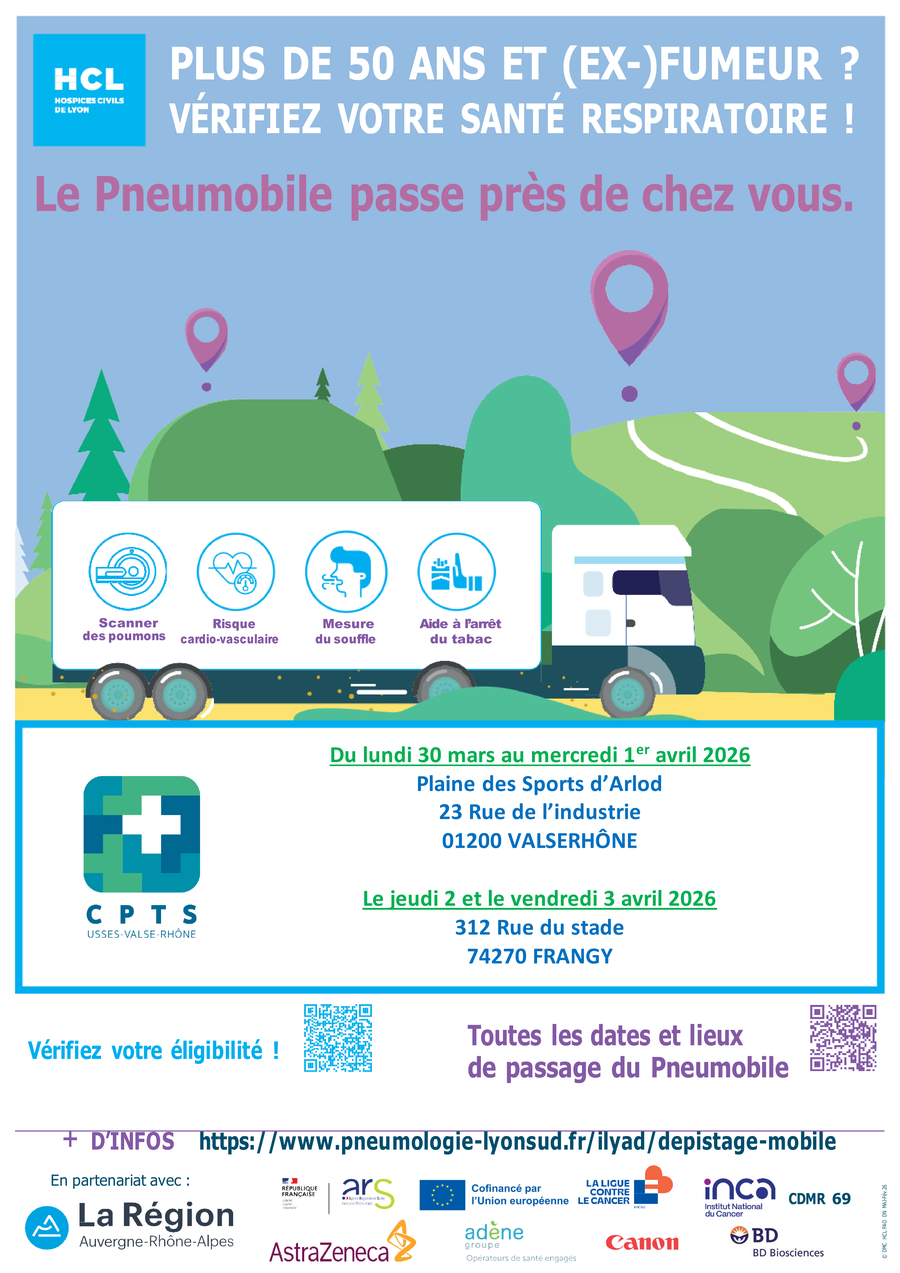Dépistage du cancer du poumon : présence du pneumobile des Hospices Civils de Lyon à Frangy les 2 et 3 avril 2026 !