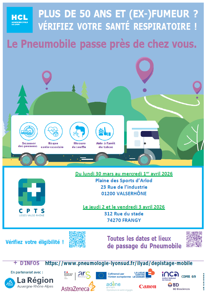 Dépistage du cancer du poumon : présence du pneumobile des Hospices Civils de Lyon à Frangy les 2 et 3 avril 2026 !