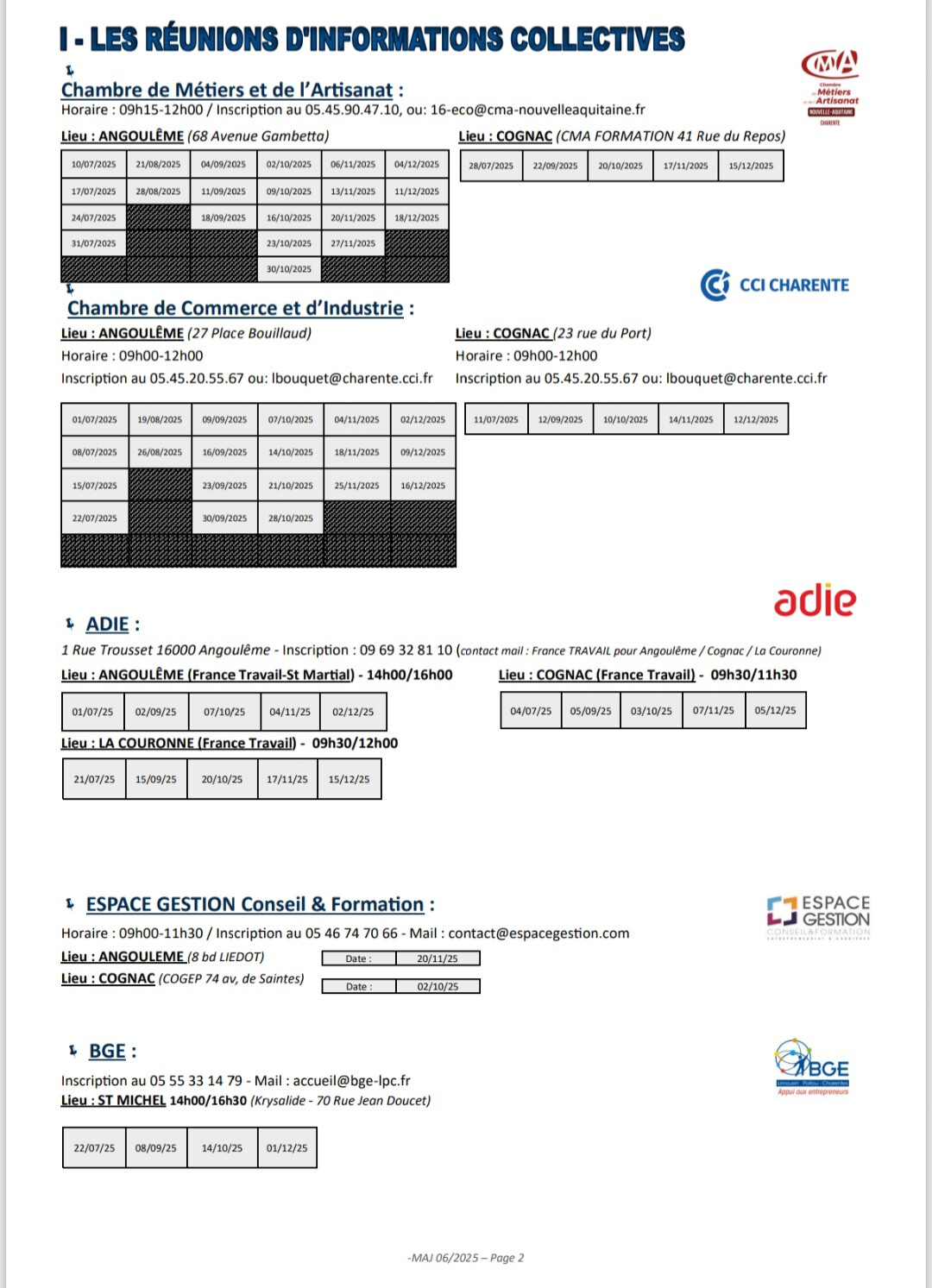 La CMA NA Charente et les membres du Groupement du Dispositif Entreprendre 16 (CCI Charente, Adie, Réseau Entreprendre, BGE, Espace Gestion, France Active, et Réseau Initiative), soutenus par la Région Nouvelle-Aquitaine dans le cadre du dispositif « ENTREPRENDRE, LA REGION A VOS COTES », propose des réunions d’information collectives et des permanences sur les différents territoires de la Charente.