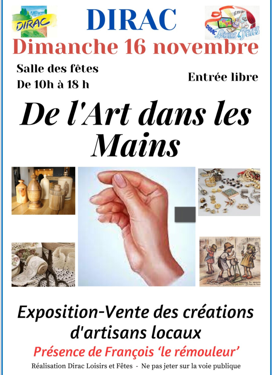 Depuis plus de 12 ans, Dirac Loisirs et Fêtes organise une exposition-vente de produits et œuvres d'artisans locaux ( bijoux, broderies, objets de décoration, confection, etc).