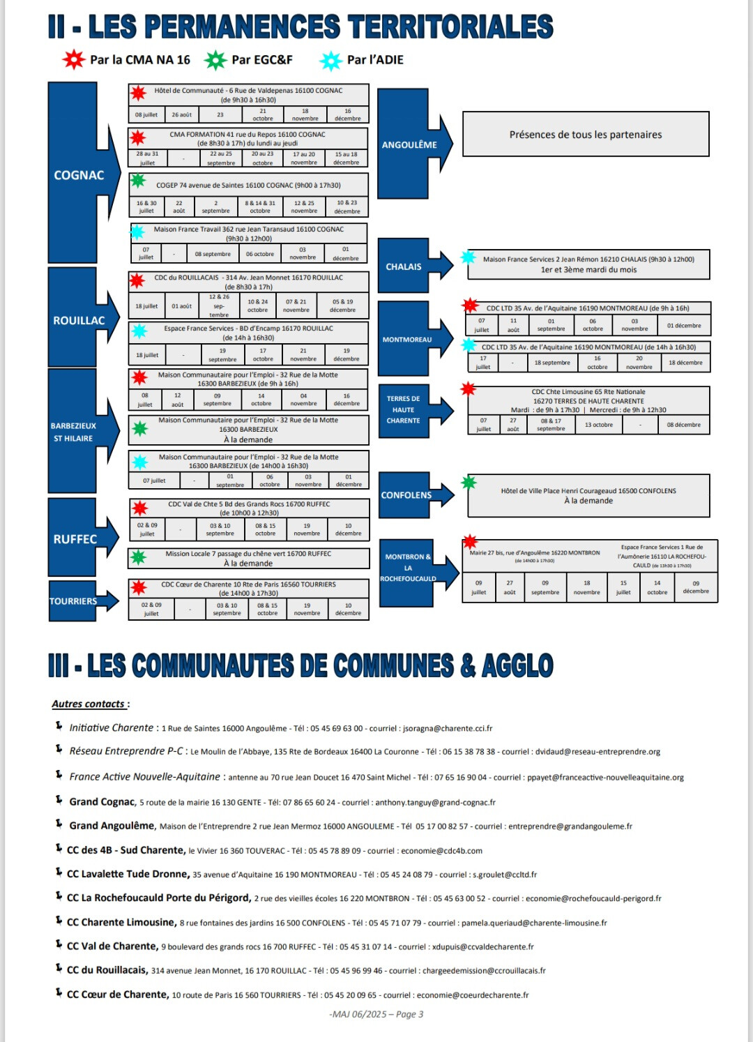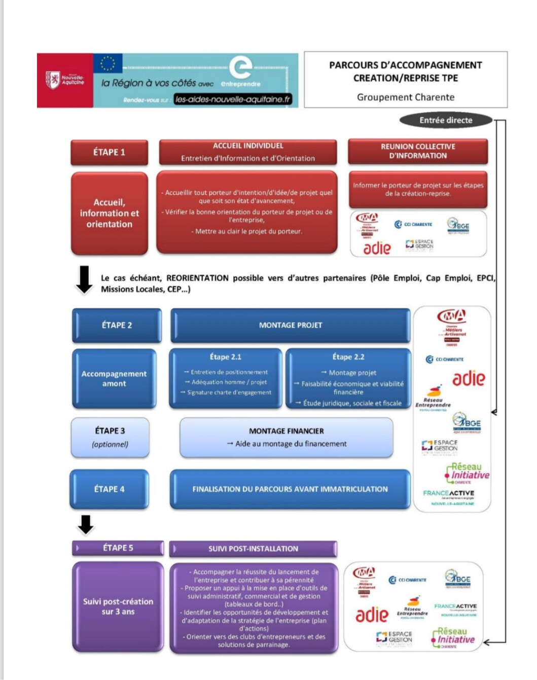 La CMA NA Charente et les membres du Groupement du Dispositif Entreprendre 16 (CCI Charente, Adie, Réseau Entreprendre, BGE, Espace Gestion, France Active, et Réseau Initiative), soutenus par la Région Nouvelle-Aquitaine dans le cadre du dispositif « ENTREPRENDRE, LA REGION A VOS COTES », propose des réunions d’information collectives et des permanences sur les différents territoires de la Charente.