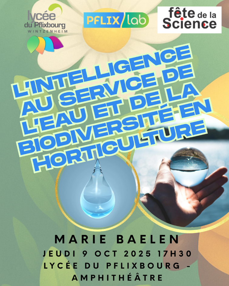 "L'intelligence au service de l'eau et de la biodiversité en horticulture" de Marie Baelen, ingénieure agronome à l'Institut Astredhor : jeudi 9 octobre, 17h30 à l'amphithéâtre du lycée