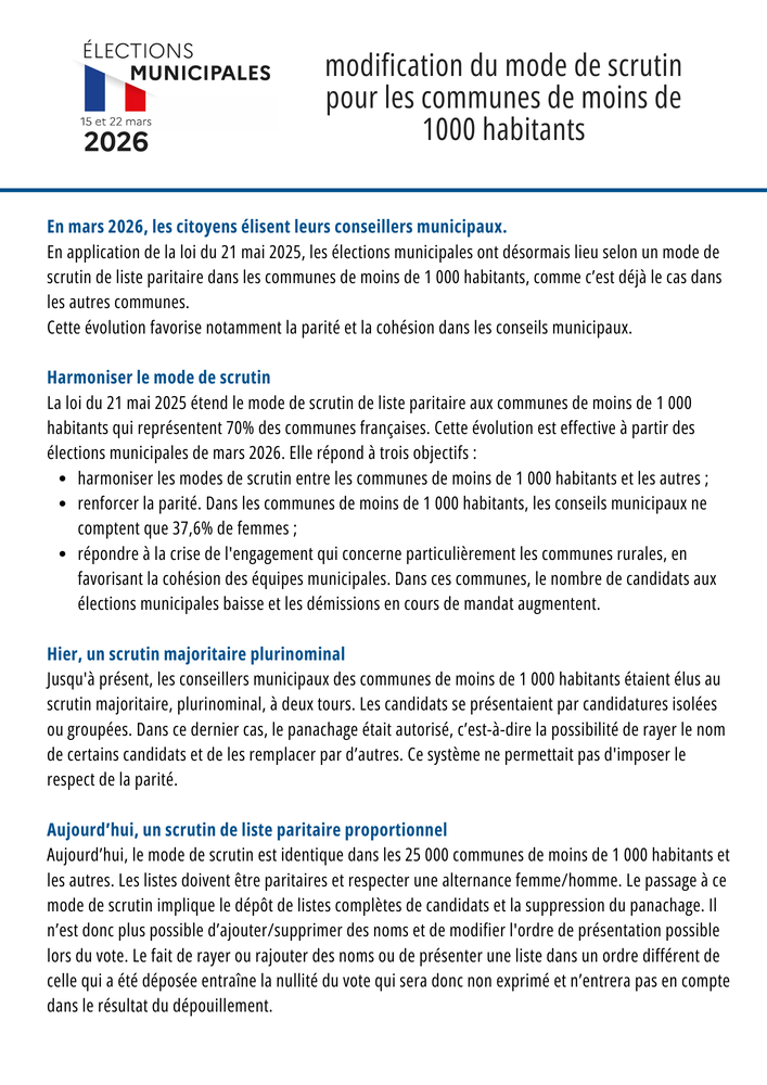 En annexe les nouvelles consignes de vote pour les élections municipales dans les communes de moins de 1000 habitants.