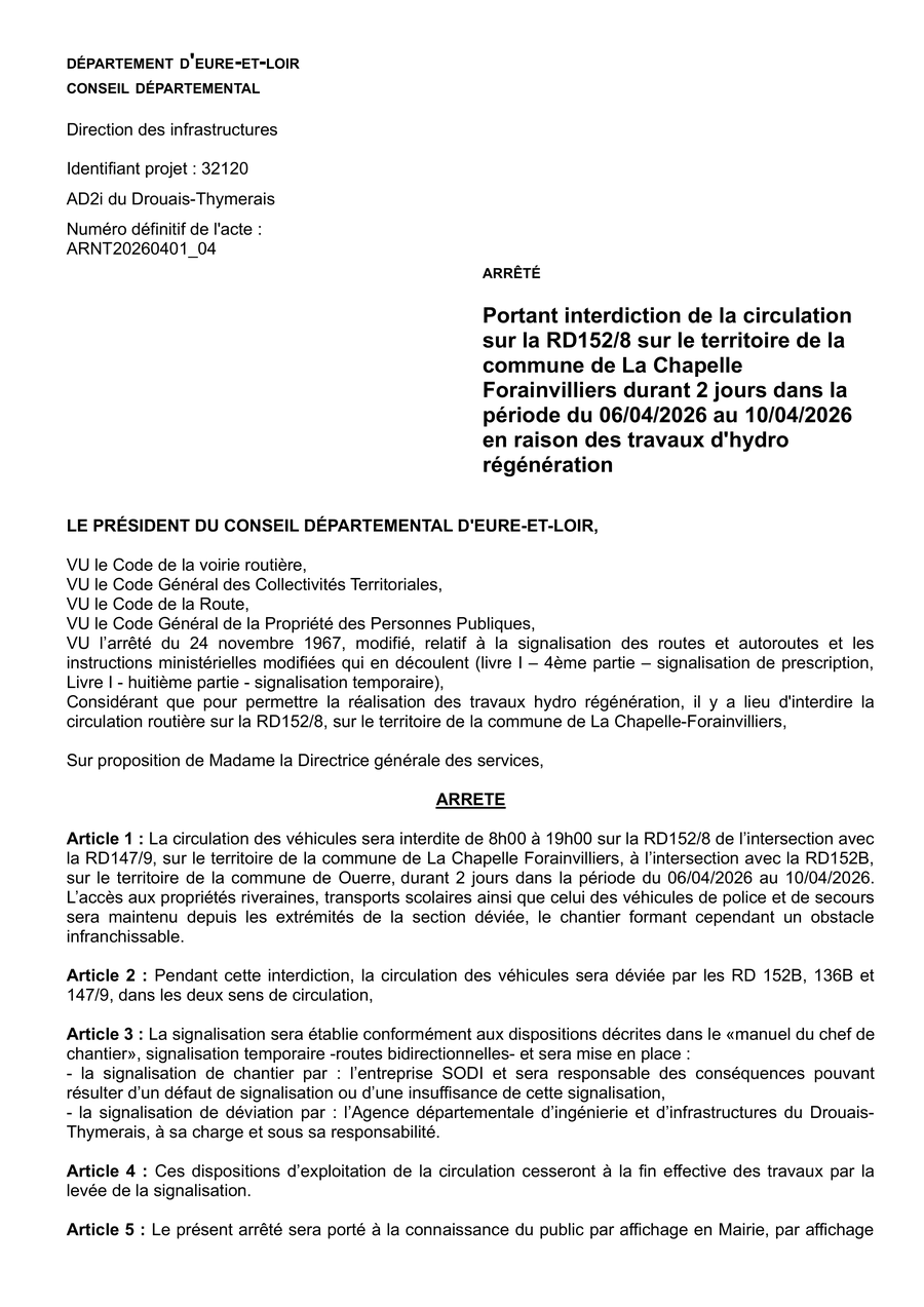 Nous vous informons que la Rue de la Libération sera barrée à partir du panneau CHAPELLE-FORAINVILLIERS côté cimetière jusqu'à l'intersection de la route Mérangle-Prouais (dépôt Conseil Départemental)