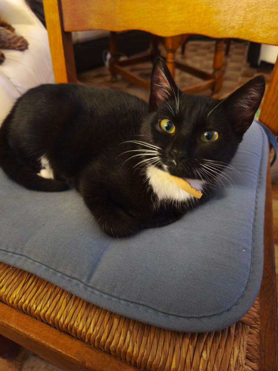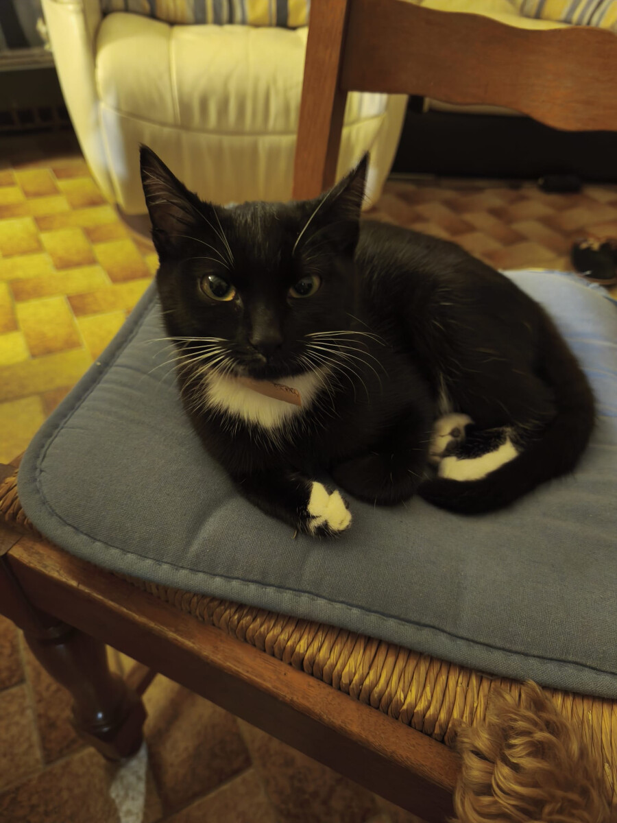 Trouvée samedi soir sur la route direction Goas Caradec, adorable petite chatte noire avec bout des pattes blanc, ventre blanc, collier anti puces rose.