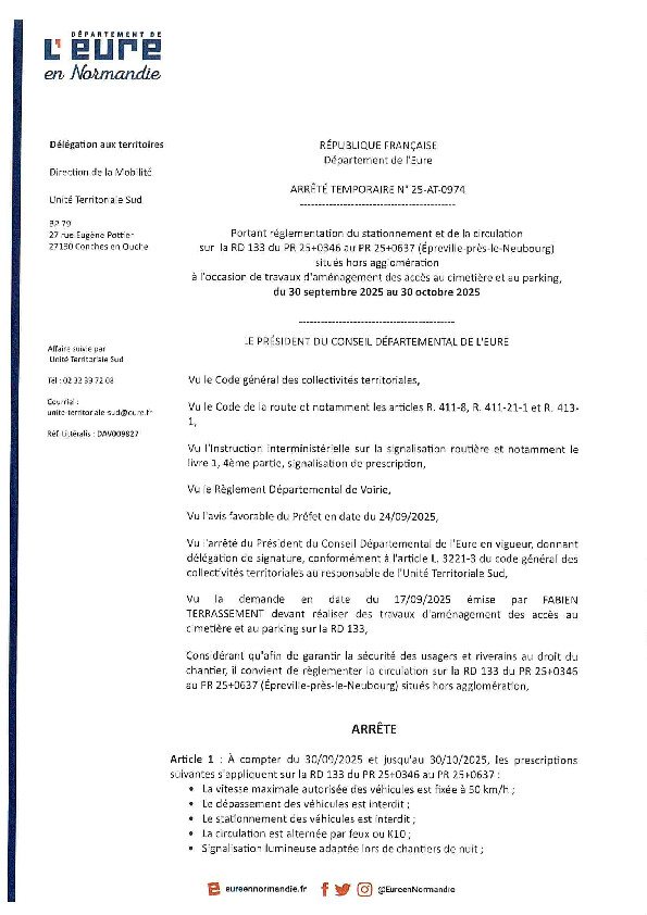 L'accès sur le Chemin Vicinal N° 69 reliant la Route de Beaumont et la Rue de la Garenne sera interdit pendant les travaux d'aménagement des accès au cimetière et au parking.