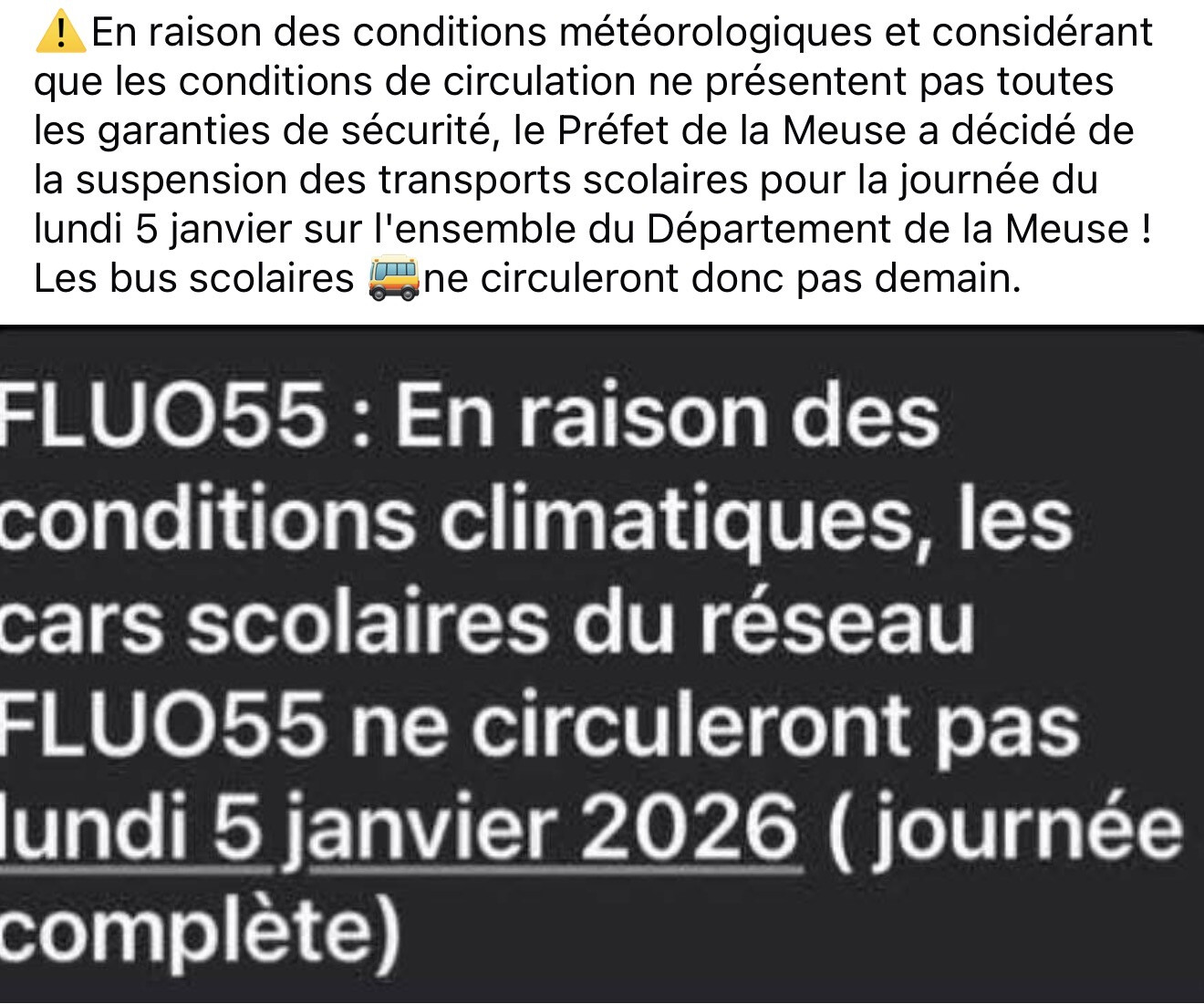 🚫 En concertation avec l'ensemble des partenaires (conseil régional, conseil départemental, services de l’État) et considérant que les conditions de circulation ne présentent pas toutes les garanties de sécurité, un arrêté préfectoral interdisant la circulation des transports scolaires a été pris sur la plage horaire la plus délicate, soit du lundi 12 janvier 2026 à minuit jusqu'au lundi 12 janvier 2026 à 12h sur l'ensemble du département de la Meuse.