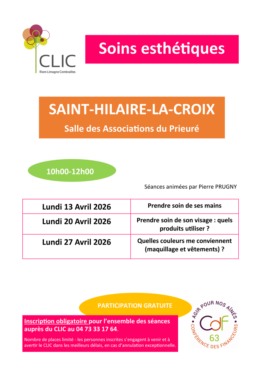 Le CLIC animera 3 ateliers de soins esthétiques courant avril.