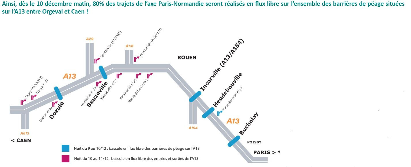 En décembre 2024, c’est le reste de l’axe Paris-Normandie, sur l’A13 entre Orgeval et Caen (14) qui passera en péage en flux libre. Plus simple, fluide, rapide et plus responsable Avec le péage en flux libre, les conducteurs n'ont plus besoin de s'arrêter pour payer le péage. Le paiement s’effectue une fois l’ensemble du trajet terminé, dans un délai de 72h. Les barrières physiques de péage sont remplacées par des portiques équipés de capteurs et de caméras pour calculer et automatiser le règlement des trajets des clients.