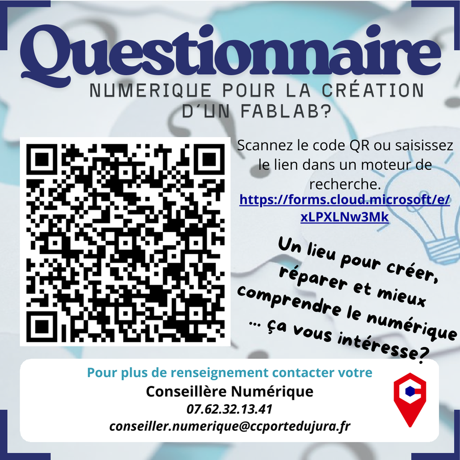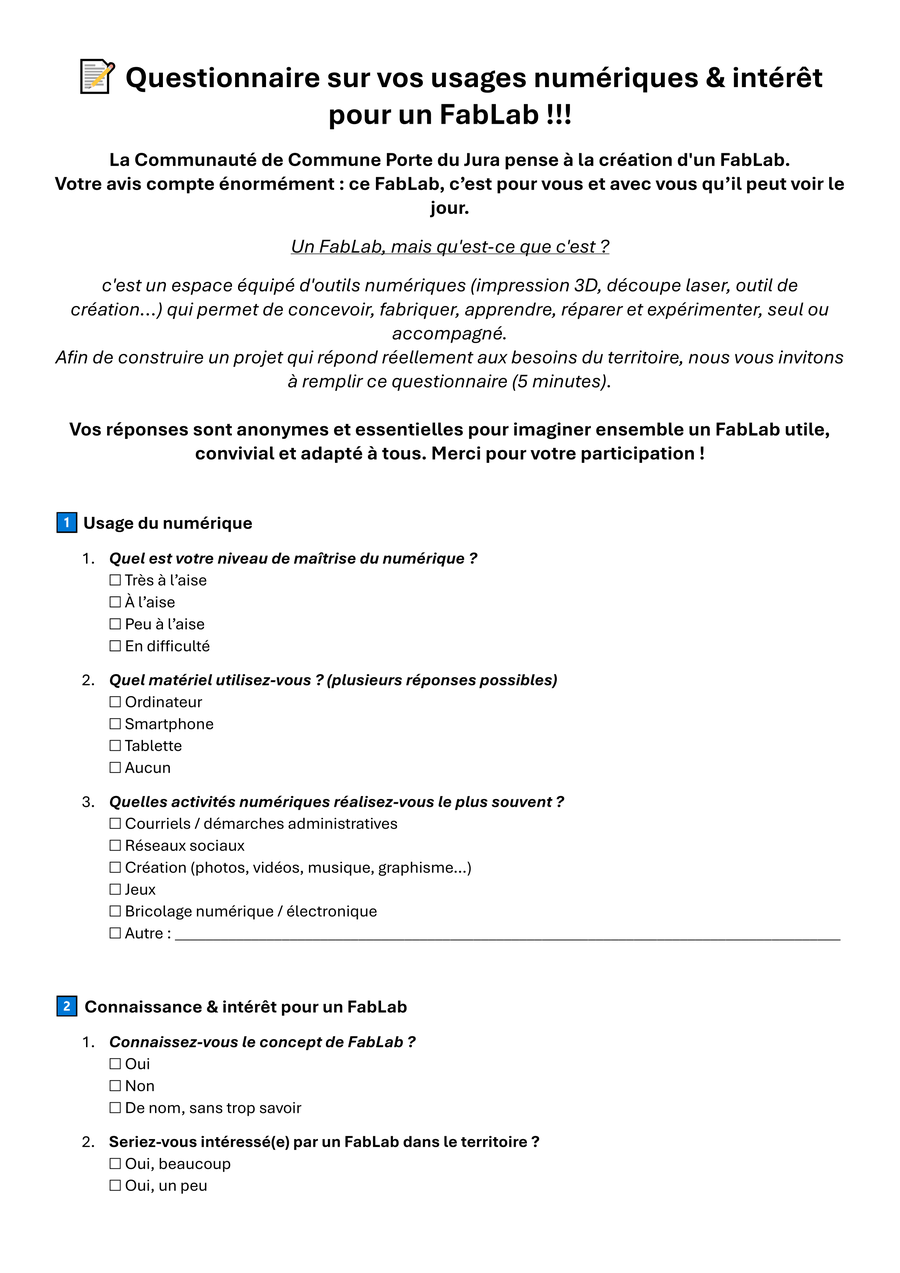 Dans une démarche de concertation et de co‑construction, elle lance un questionnaire à destination de la population, afin de mieux identifier les besoins, attentes et usages liés au numérique et aux espaces de fabrication.