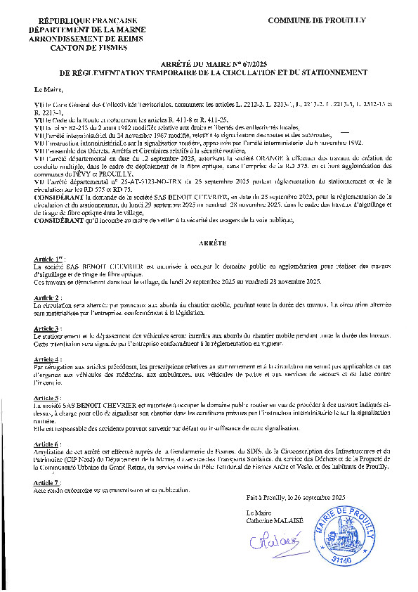 Vous trouverez ci-dessous lâarrĂȘtĂ© n° 73/2025 qui rĂ©glemente la circulation et le stationnement pendant ces travaux.
