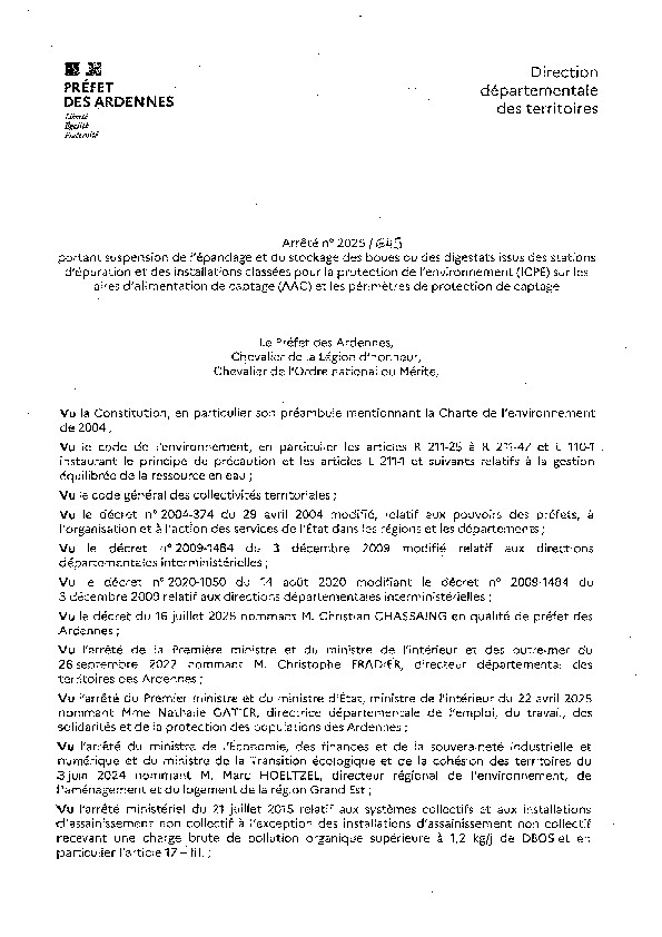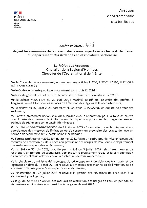 Arrêté n°2025-658 du 30 septembre plaçant les communes de la zone d'alerte Aisne Ardennaise du département des Ardennes en état d'alerte sécheresse.