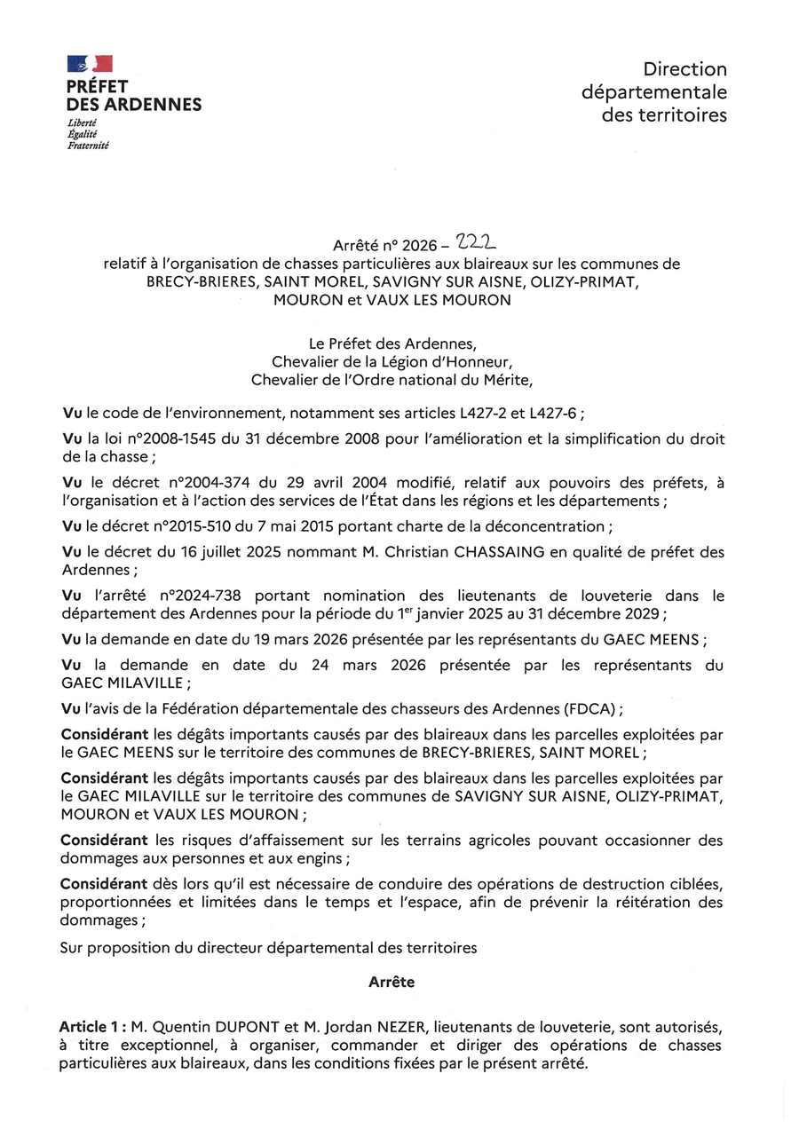 Veuillez trouver ci-joint l'arrêté préfectoral 2026-222 relatif à l’organisation de chasses particulières aux blaireaux sur les communes de