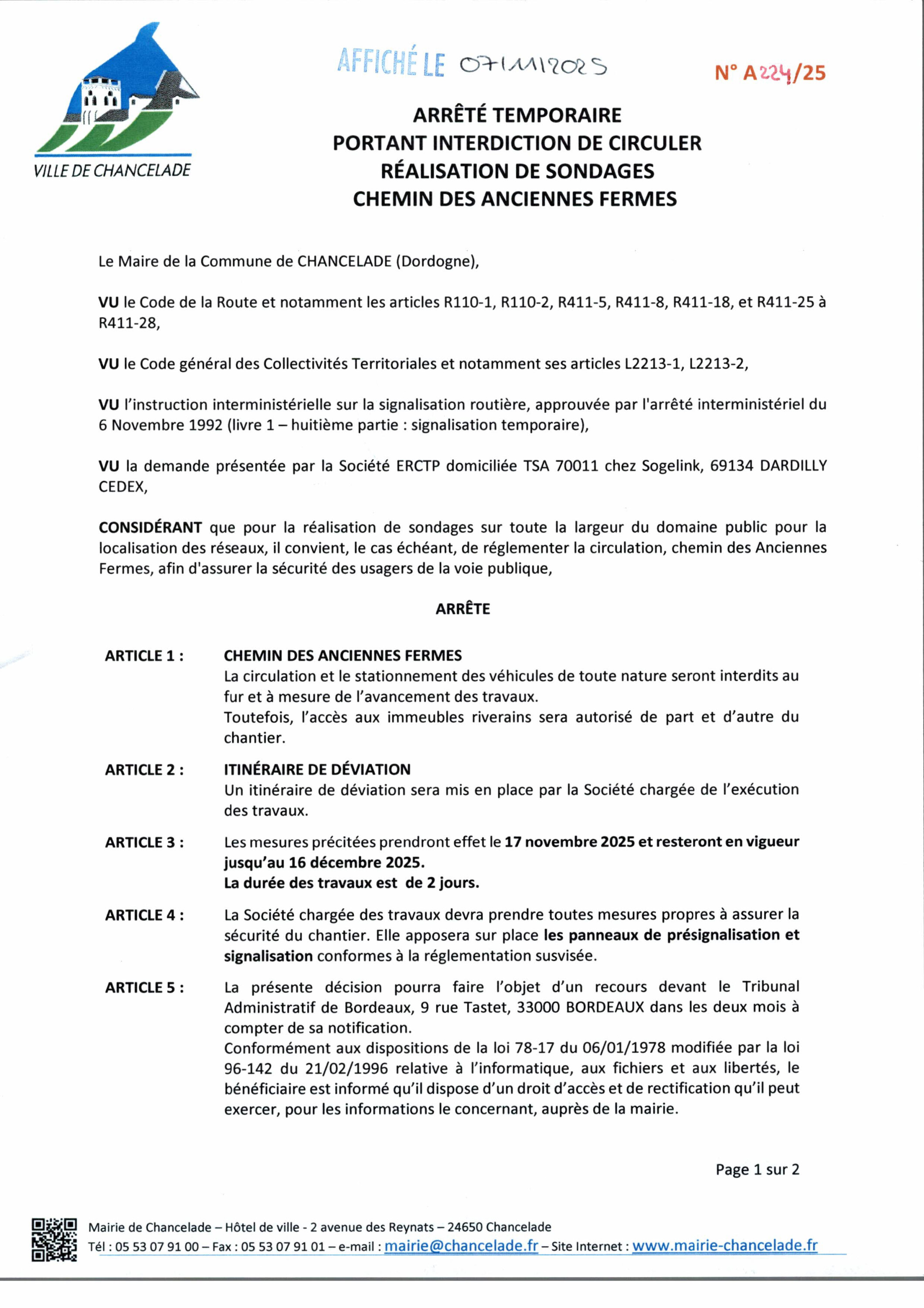 Afin de réaliser des sondages sur toute la largeur du domaine public pour la localisation des réseaux chemin des Anciennes Fermes, la circulation sera règlementée afin d'assurer la sécurité des usagers de la voie publique.