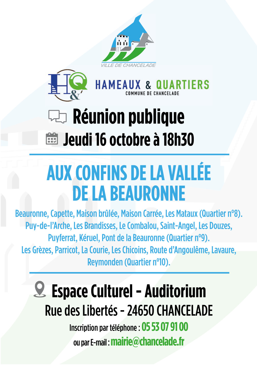 Quartier n°8 (Beauronne, Capette, Maison brûlée, Maison Carrée, Les Mataux). Quartier n°9 (Puy-de-l’Arche, Les Brandisses, Le Combalou, Saint-Angel, Les Douzes, Puyferrat, Kéruel, Pont de la Beauronne). Quartier n°10 (Les Grèzes, Parricot, La Courie, Les Chicoins, Route d’Angoulême, Lavaure, Reymonden)