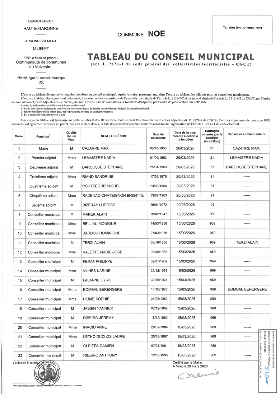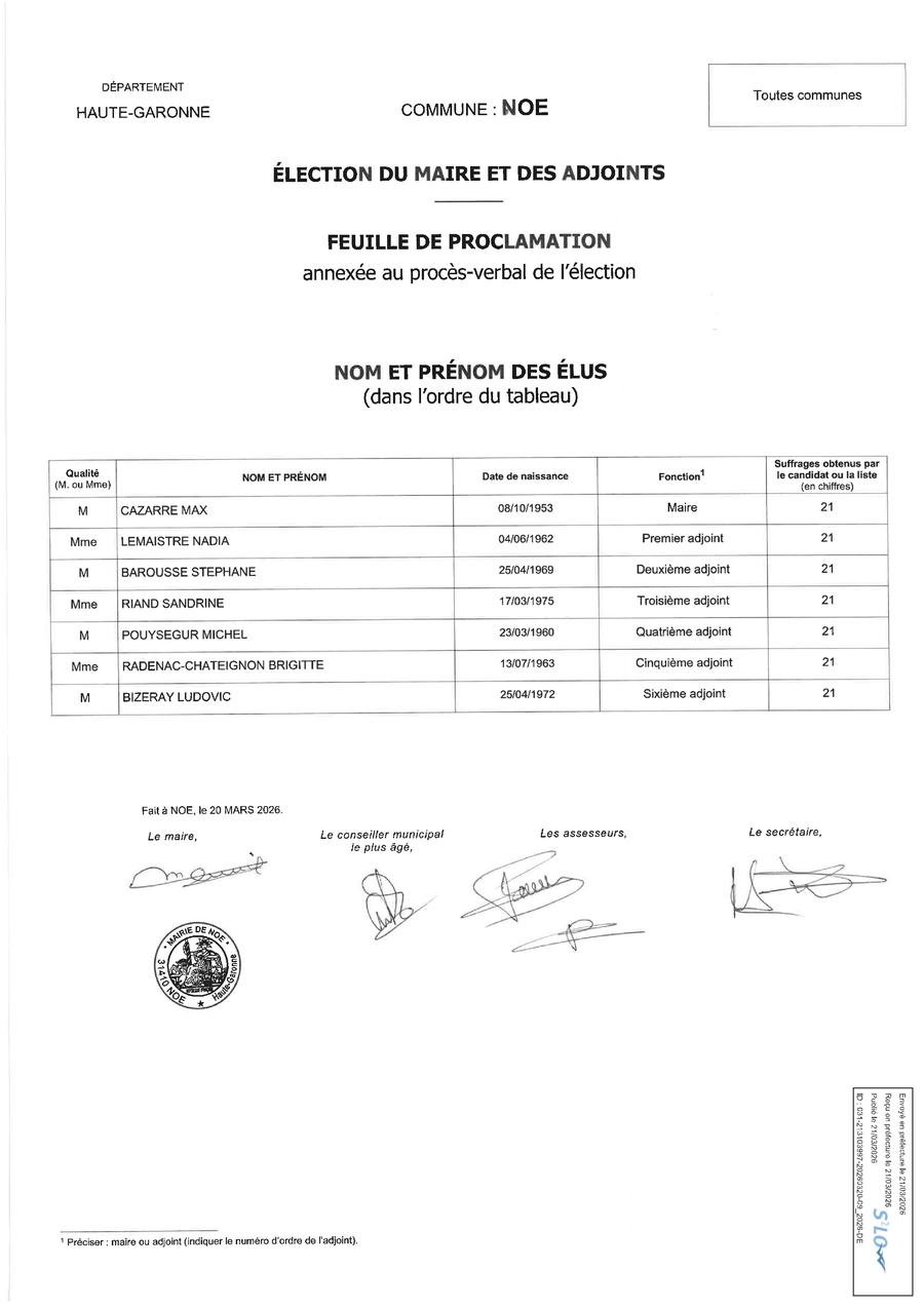 Ci-dessous, vous pourrez prendre connaissance de la feuille de proclamation des résultats ainsi que du tableau du Conseil municipal de Noé pour la mandature 2026-2032