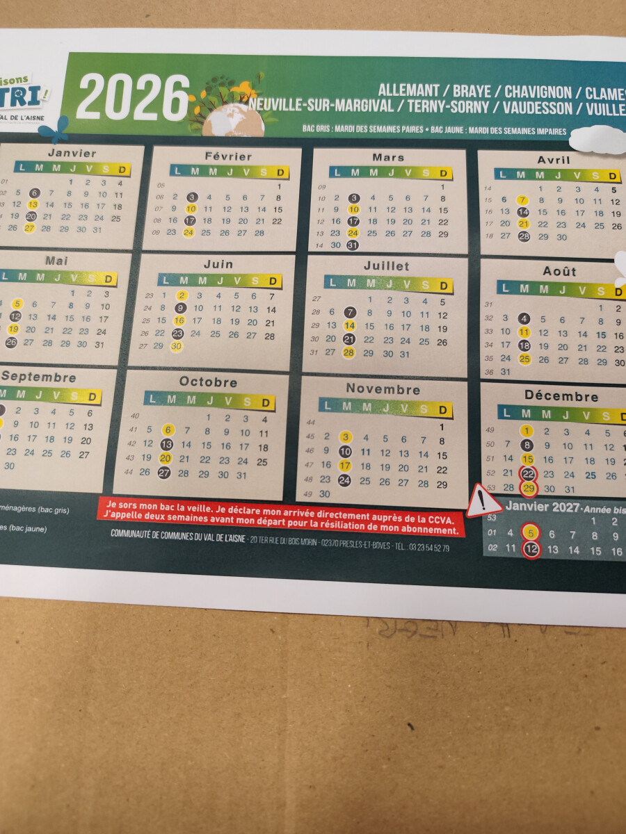 N'ayant pas encore pu récupérer les calendriers de vos jours et bacs de collecte des déchets, pour vous les distribuer, en attendant voici le calendrier que nous avons pu imprimer.