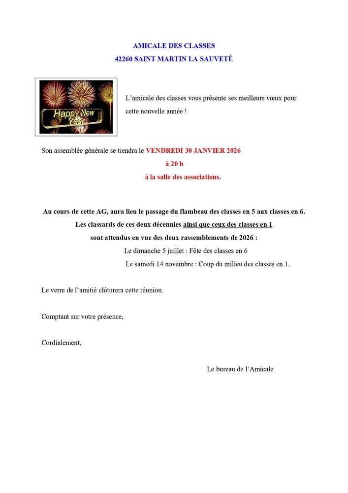 L'Assemblée Générale du Club de l'Amitié de Saint Martin la Sauveté se tiendra le 3 février 2026 à 11h.
