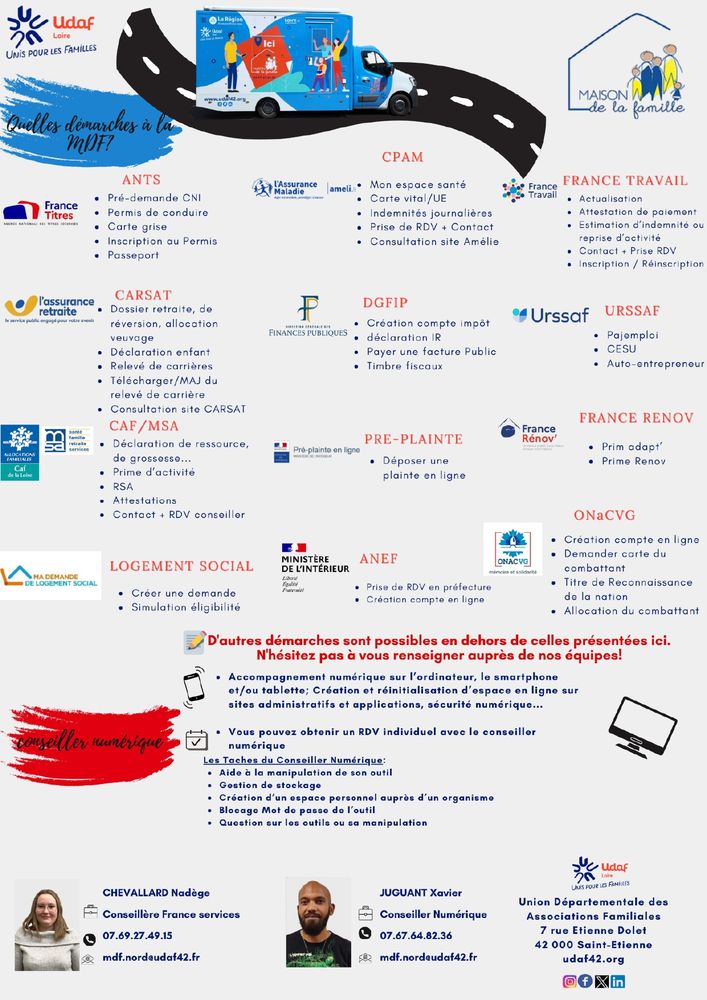 La Maison de la Famille (Bus UDAF) est labélisée France service, ses missions : accueillir, informer et accompagner gratuitement tous les publics sur les thèmes : numérique, parentalité, budget, logement, formation, emploi, retraite, famille, santé, mobilité, justice, renseignements sur les aides et accès aux droits …