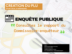À l’issue de l’enquête publique relative au projet du PLU, le commissaire enquêteur a rendu son rapport et ses conclusions qui sont disponibles sur le site internet de la commune et en consultation papier au secrétariat de la Mairie.