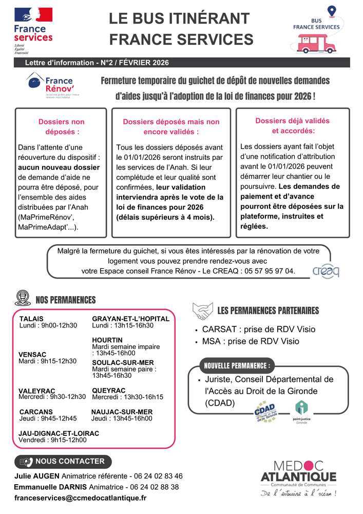 Le bus France services va parcourir les communes de la CDC Médoc Atlantique pour venir aux plus près des habitants afin de les aider dans leurs démarches administratives.