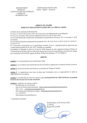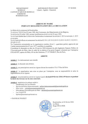 Nous vous informons que dans le cadre de son programme de travaux pour 2025, l'Eurométropole de Metz et la commune de Rozérieulles ont planifié la requalification du centre bourg de Rozérieulles (rue Jean Burger, rue de l'Ecole Centrale et rue du Jeu de Quille) entre la rue des Roses et la place Cadet à partir du 18 août 2025. Ces travaux s’effectueront pour une durée de sept mois jusque mars 2026 (hors aléas techniques et météorologiques).