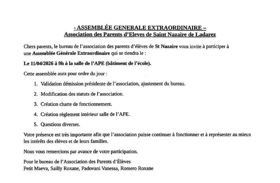➡️ L'Association des Parents d'Élèves de Saint Nazaire organise une Assemblée Générale Extraordinaire le