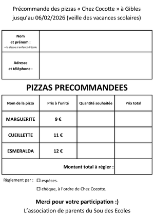 L’association du Sou des Ecoles organise, en partenariat avec la Boulangerie de Gibles, une vente de pizzas au profit des projets pédagogiques des écoles du RPI.