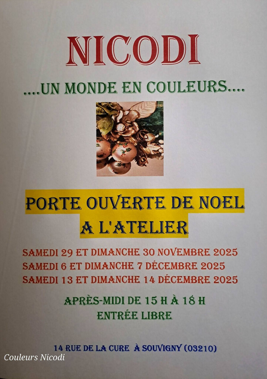 En parallèle du Marché des Artisans Créateurs, l'artiste Couleurs Nicodi organise des Portes ouvertes de Noël dans son atelier au 14 rue de la Cure.