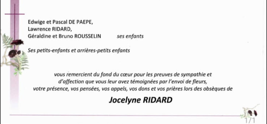 la famille de Jocelyne Ridard adresse ses remerciements.