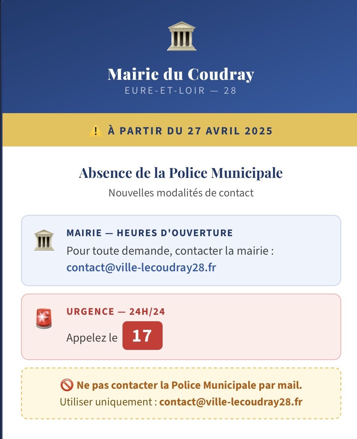 ⚠️ Ne pas contacter la Police Municipale par mail durant cette période.