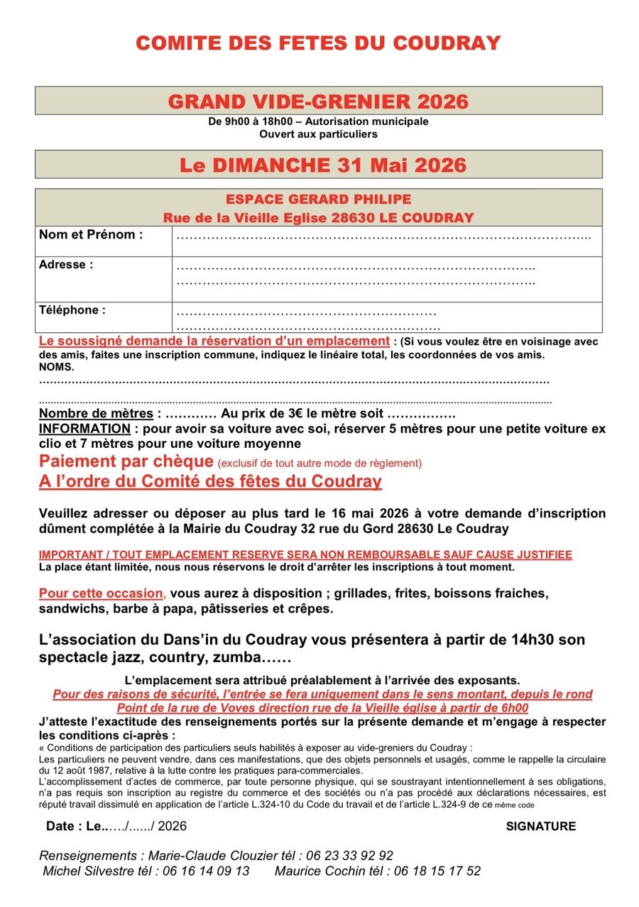 Pour toute demande : contactez la Mairie, au 0237281714, aux heures d’ouverture.