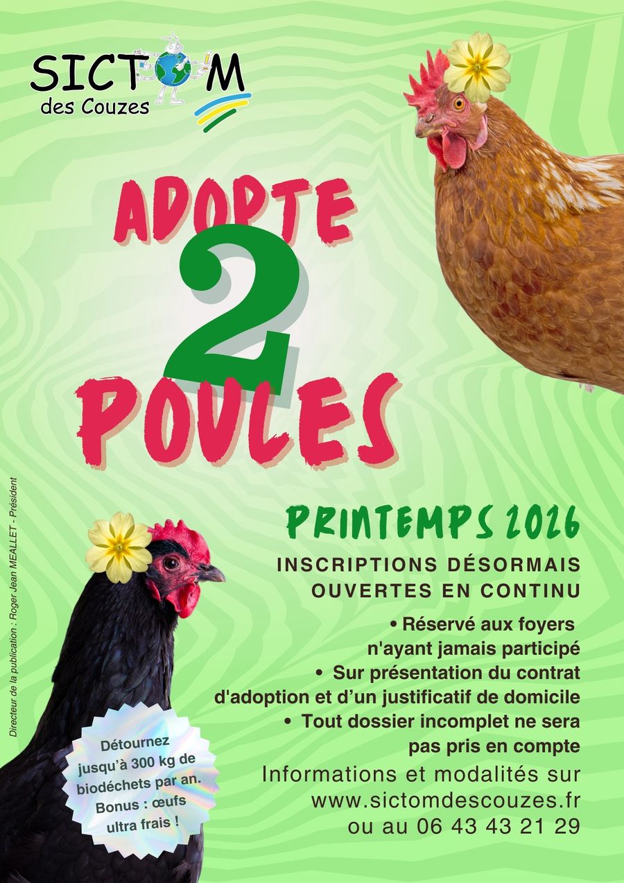 Le SICTOM des Couzes lance une nouvelle campagne d'adoption de poules, de précieuses alliées pour éliminer et valoriser les déchets alimentaires au lieu de les jeter à la poubelle grise.