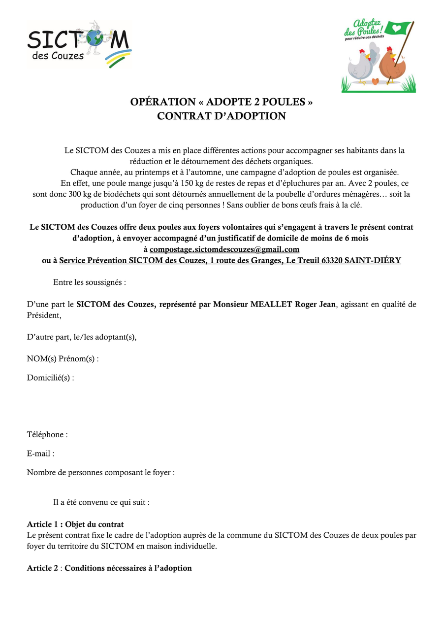 Les candidats doivent envoyer par mail ou par courrier postal un justificatif de domicile de moins de 6 mois ainsi que le contrat d'adoption qui est sur notre site Internet (https://sictomdescouzes.fr/la-prevention/operation-adopte-une-poule/).
