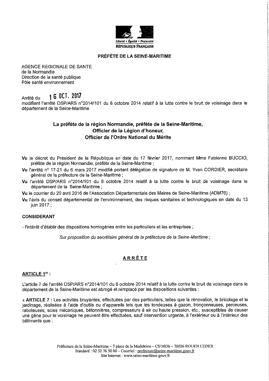 Références : arrêté Préfectoral du 16 octobre 2017 portant réglementation des bruits de voisinage dans le Département de la Seine-Maritime.