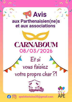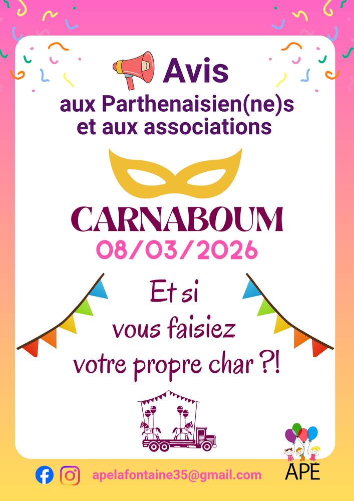 🥳 L'APE organise son Carnaboum Dimanche 8 Mars, à partir de 15h30.