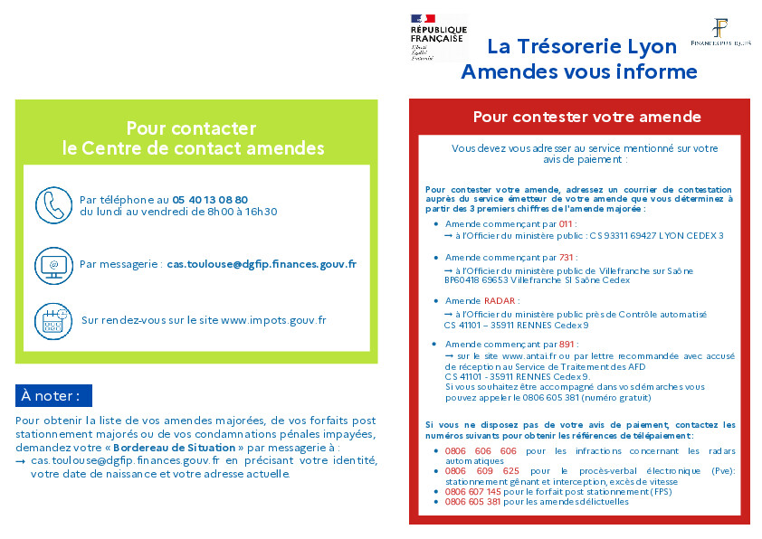 Depuis le 1er septembre 2025, les usagers de la Trésorerie Lyon amendes sont invités à contacter le Centre de contact amendes centralisateur de Toulouse pour tous types de demandes adressés par mail ou par téléphone : 05 40 13 08 80 ;cas.toulouse@dgfip.finances.gouv.fr